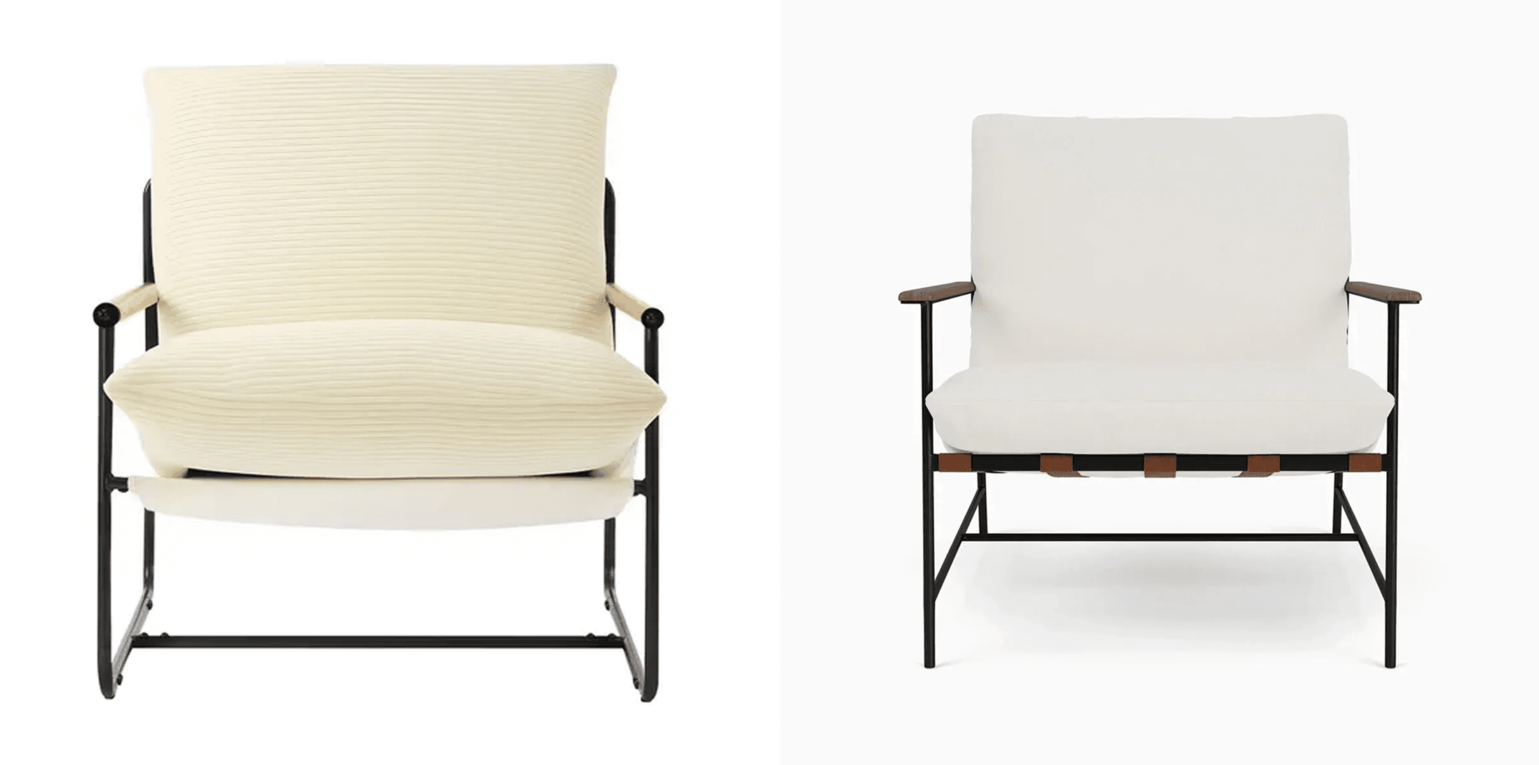 A $131.83 accent chair captures the same light, modern silhouette as a $1,795 designer version. Both offer structured lines and soft cushions, yet the price difference is dramatic. This comparison shows how accessible contemporary design can be when shoppers know where to look.